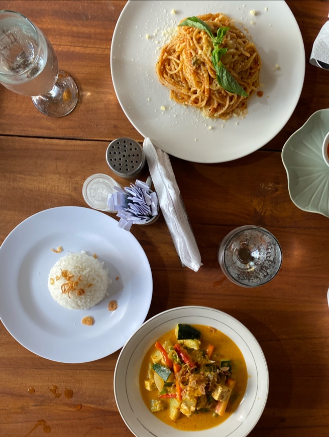 We were on our way out for the day and it started raining, we stumbled upon this wonderful quaint restaurant. Since we only ate some fruits for breakfast, we were HUNGRY. Ordered soups, spaghetti and a Balinese flavoured Pizza. All of which were absolutely delicious. FANTASTIC. Very sweet service, so kind and polite. Each dish was freshly cooked and perfectly seasoned.